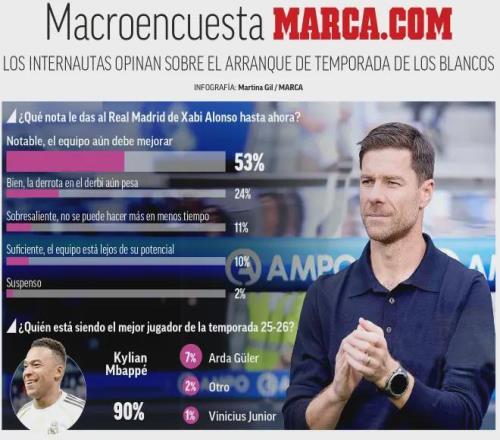 馬卡調(diào)查球迷對(duì)皇馬本賽季評(píng)價(jià):阿隆索表現(xiàn)出色,姆巴佩最佳